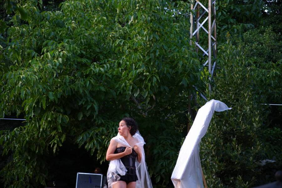 En la obra se incluye música para crear un espacio sonoro. La propuesta es muy plástica y combina música, poesía y danza. Buscando un lenguaje creativo, incluyendo el entorno natural, para comunicarse con el público.